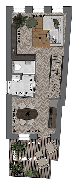 Maisonnette F bevindt zich aan de Grote Akkerstraat, met op de eerste verdieping de woonkamer, keuken en
